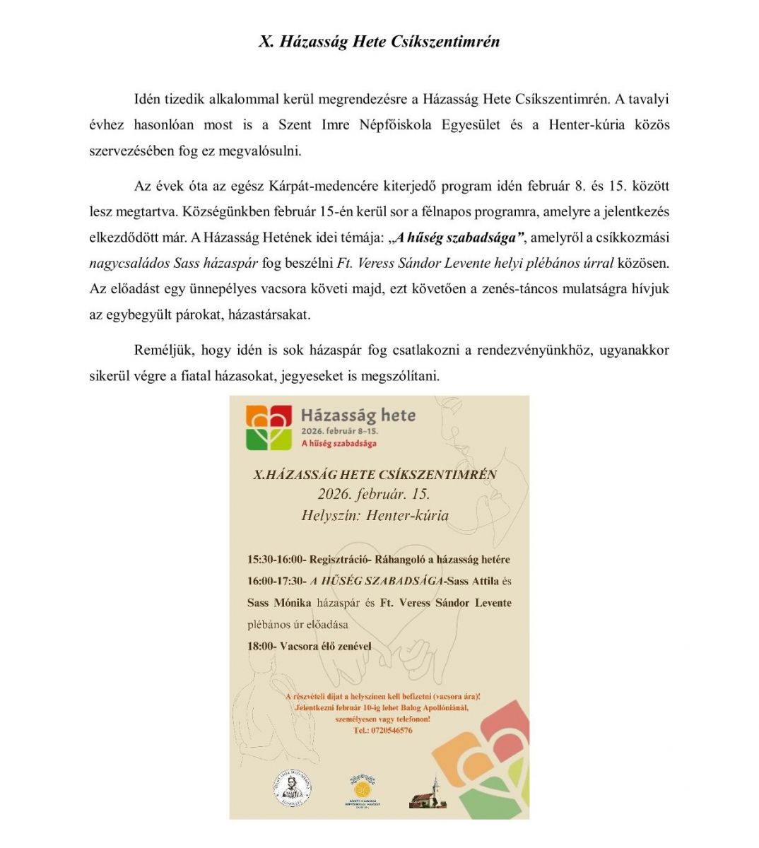 További információért látogassanak el az csíkszentimrei Szent Imre Népfőiskola Egyesület honlapjára.