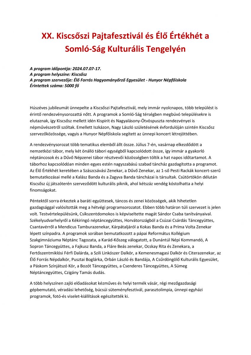 További információért látogassanak el a kiscsőszi Élő Forrás hagyományőrző Egyesület - Hunyor Népfőiskola honlapjára.